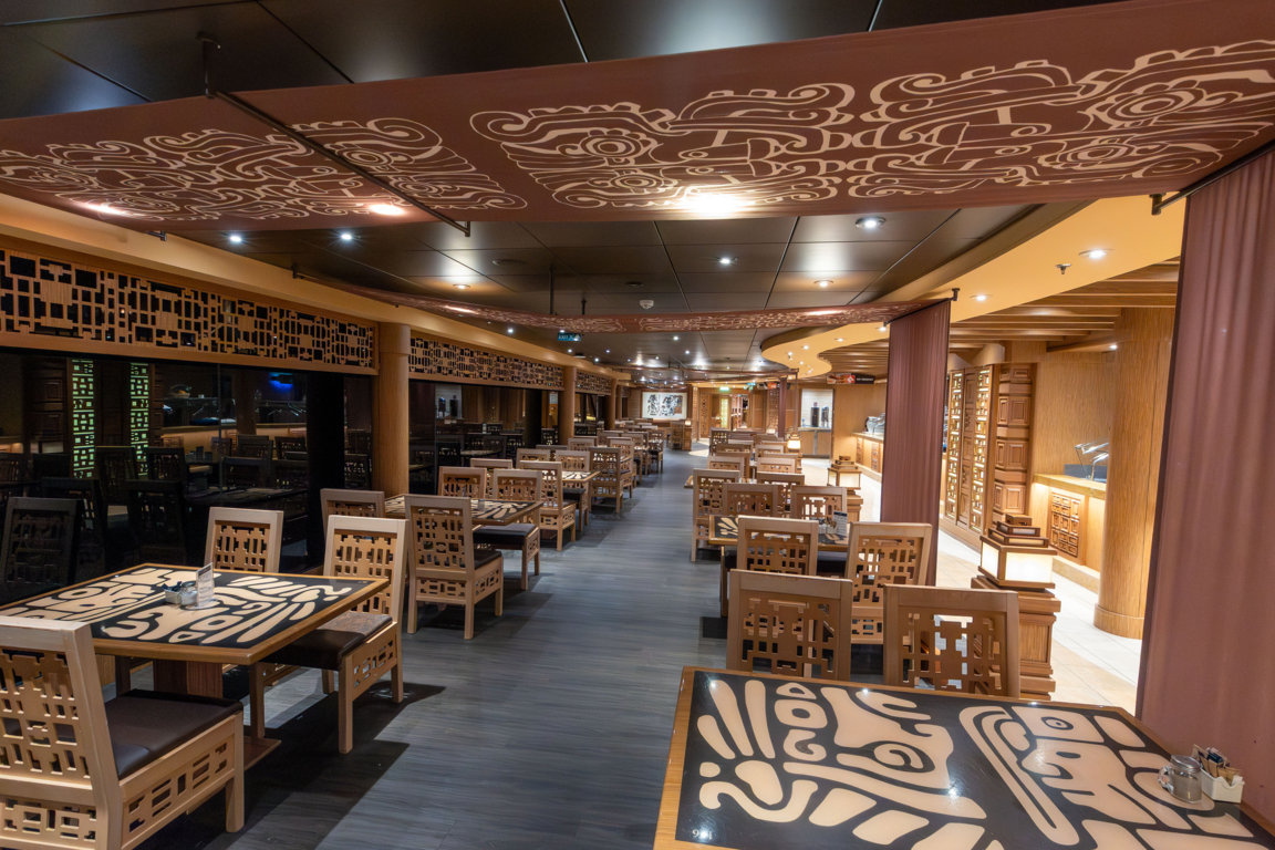 La Playa Preciosa ist der Name des über zwei Decks reichenden Innenpoolbereichs, der sich achtern anschließt. Neben dem bis zu 1,90 Metern tiefen Swimmingpool laden hier Whirlpools zum Verweilen und Relaxen ein – auf der Empore auf Deck 15 stehen zudem Tischfußball und Tischtennisplatten zur Verfügung. Die Bar hält eine besondere Karte mit Smoothies, Shakes & Co. bereit, die anderswo auf dem Schiff nicht erhältlich sind. An den überdachten Poolbereich schließt sich auf Deck 14 das große Hauptpooldeck an, genannt Aqua Park. Wer zuweilen laute Animation im mediterranen Stil mag, ist hier zu bestimmten Tageszeiten genau richtig. Darüber hinaus bietet der großzügige Außenbereich viel Platz für Sonnenliegen und Sitzplätze, teilweise auch für Raucher. Auch ein Deck höher auf Deck 15 finden Sonnenhungrige zahlreiche Liegen. Am achteren Ende des Pooldecks liegen die beiden Bars Saphir und Tuquoise – an letzterer kann auch feines Gelato erworben werden! Den gesamten Heckbereich von Deck 14 nehmen die ineinander übergehenden Buffetrestaurants Inca (vorn) und Maya (achtern) ein. Neben einer Vielzahl von Essens- und Getränkeausgaben gibt es hier auch eine Bar. Im vorderen Bereich wird fortwährend sehr gute Pizza gebacken, die nahezu ganztätig kostenlos erhältlich ist.