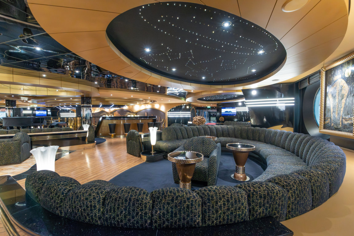 Das Casino ist durch eine offene Lobby mit der darüber auf Deck 7 liegenden El Dorado Piano Bar verbunden. Diese wirkt mit ihren großzügigen Sitzgruppen, dem an Schiffsplanken erinnernden Fußboden sowie den vorherrschenden Blau- und Goldtönen sehr elegant. Hinter dem anschließenden Treppenhaus liegen weiter achtern gleich zwei Bereiche: Die Green Sax Bar wirkt mit ihren charakteristischen gläsernen Lampen und den farbenfrohen Lichtsäulen sehr modern und nimmt den Platz an Steuerbord ein. Sie wird allabendlich zum Anziehungspunkt für Liebhaber moderner Unterhaltungsmusik. An Backbord hingegen liegt die Sports Bar, in der neben Getränken zu bestimmten Tageszeiten auch Snacks serviert werden. Wer keine ganz so ruhige Kugel schieben möchte, kann sich auf der 50 m² großen Bowlingbahn darin versuchen, „alle zehne“ abzuräumen. Der Raum ist standesgemäß mit diversen Sportdevotionalien dekoriert.