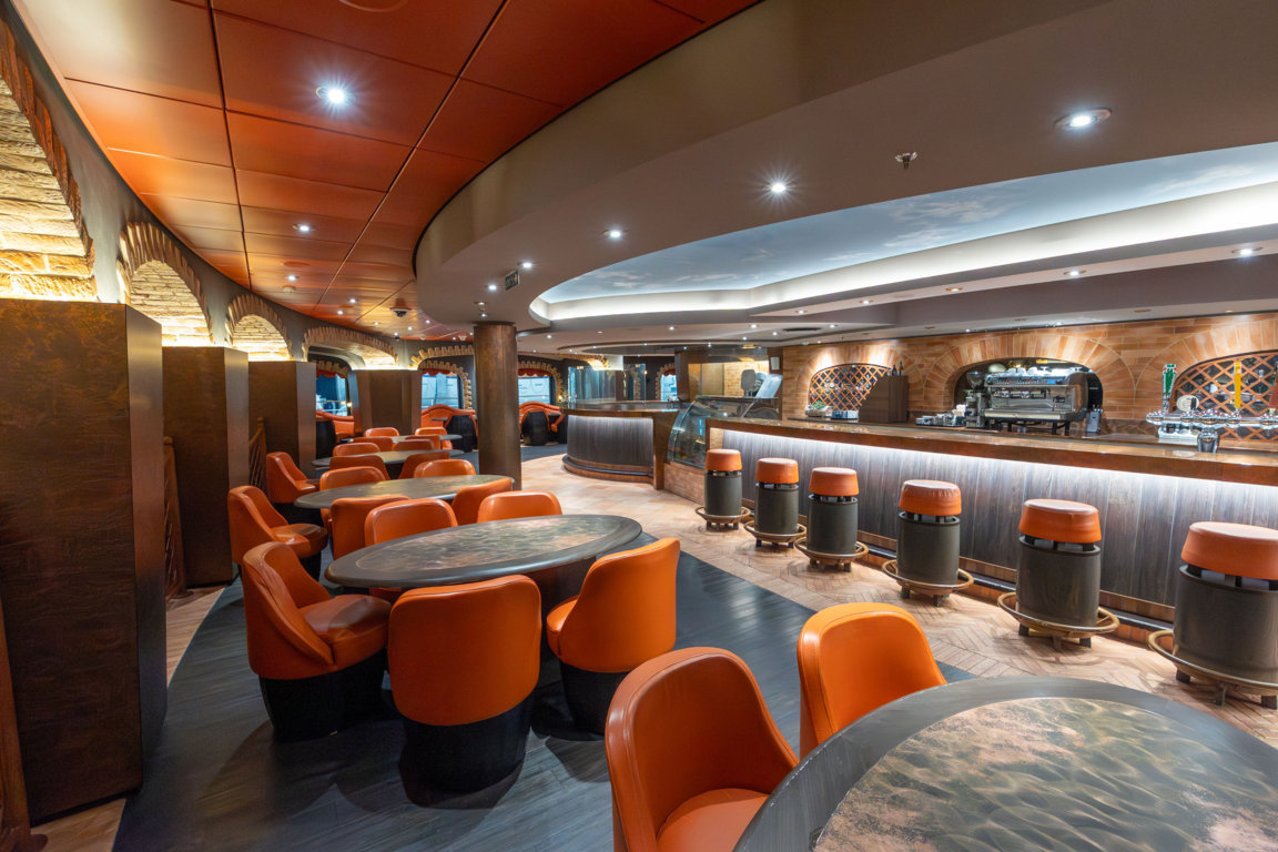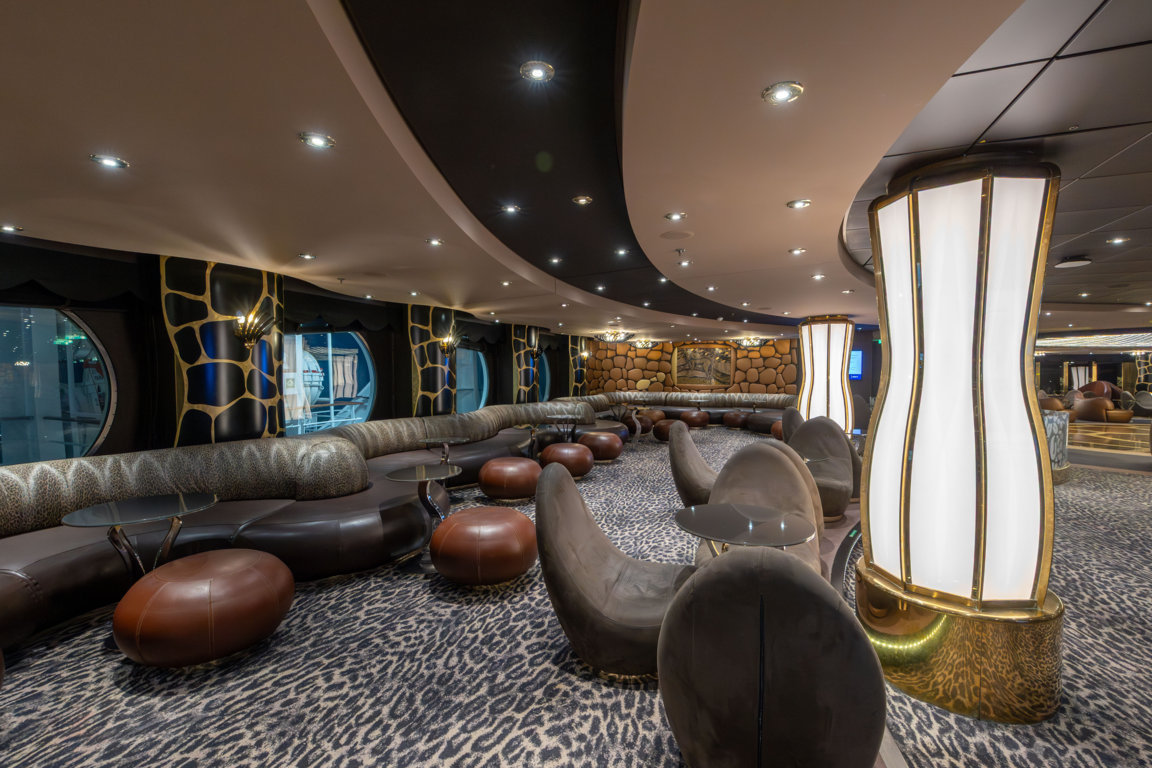 Im Stil einer rustikalen italienischen Taverna daher kommt die Weinbar La Locanda, achtern der Lobby gelegen. Auch hier spielt zuweilen Livemusik, und neben Wein und anderen Getränken ist hier auch Pizza erhältlich. An Backbord schließt sich eines der beiden Spezialitätenrestaurants der MSC Preziosa an, das American Steakhouse Butcher’s Cut mit 121 Plätzen. Es ersetzt das vormals an diese Stelle befindliche Eataly. Speisen sind entweder á la Carte oder in Form eines Dreigänge-Menüs extra zu bezahlen. Neben dem Butcher’s Cut liegt an Steuerbord die Fotogalerie, noch mit klassischen Fotowänden, auf denen die Fotoabzüge der Bordfotografen feilgeboten werden. Den Bereich hinter dem achteren Treppenhaus nimmt die Safari Lounge mit 313 Plätzen ein. Rückenlehnen und Teppich mit Leopardenmuster und Säulen, die an Giraffenhälse erinnern, erfüllen hier die Erwartungshaltung, die bei Nennung des Namens aufkommt. In der Safari Lounge können kleinere Shows stattfinden und eine große Tanzfläche lädt dazu ein, die eine oder andere an Bord hinzugewonnene Kalorie durch mehr oder weniger rhythmische Bewegungen zur Livemusik wieder loszuwerden. Auf Deck 7 befindet sich übrigens noch eine Außenpromenade – leider verläuft sie größtenteils hinter Rettungsbooten und sie ist auch nicht umlaufend. Einige freie Stellen, um den Blick aufs Meer zu genießen, gibt es aber dennoch.