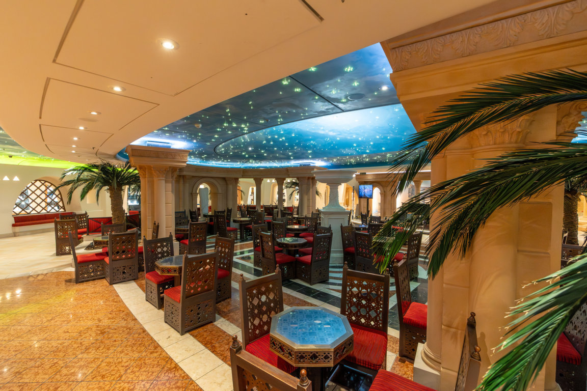 Doch fehlt da nicht noch irgendetwas? Ja, völlig richtig. Die MSC Preziosa ist das letztgebaute Schiff der Flotte, bei dem das Restaurant des MSC Yacht Club nicht Teil des „Schiff im Schiff“-Bereichs ist. Dies ist erst seit der 2017 in Dienst gestellten MSC Meraviglia der Fall. Auf der MSC Preziosa hingegen ist das orientalisch angehauchte Restaurant La Palmeraie exklusiv für Gäste des MSC Yacht Club reserviert. Es liegt dem „Schiff im Schiff“-Bereich diametral gegenüber auf Deck 15, achtern und ist zum Frühstück, Mittag- und Abendessen geöffnet.