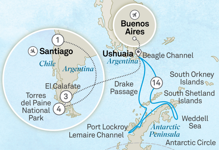 Pour ceux qui rêvent d’une aventure épique entre glaciers, mers cristallines et villes reculées, le voyage “Patagonian Adventure and Antarctica’s Weddell Sea” est une occasion unique d’explorer les confins extrêmes du monde avec élégance, sécurité et émerveillement.