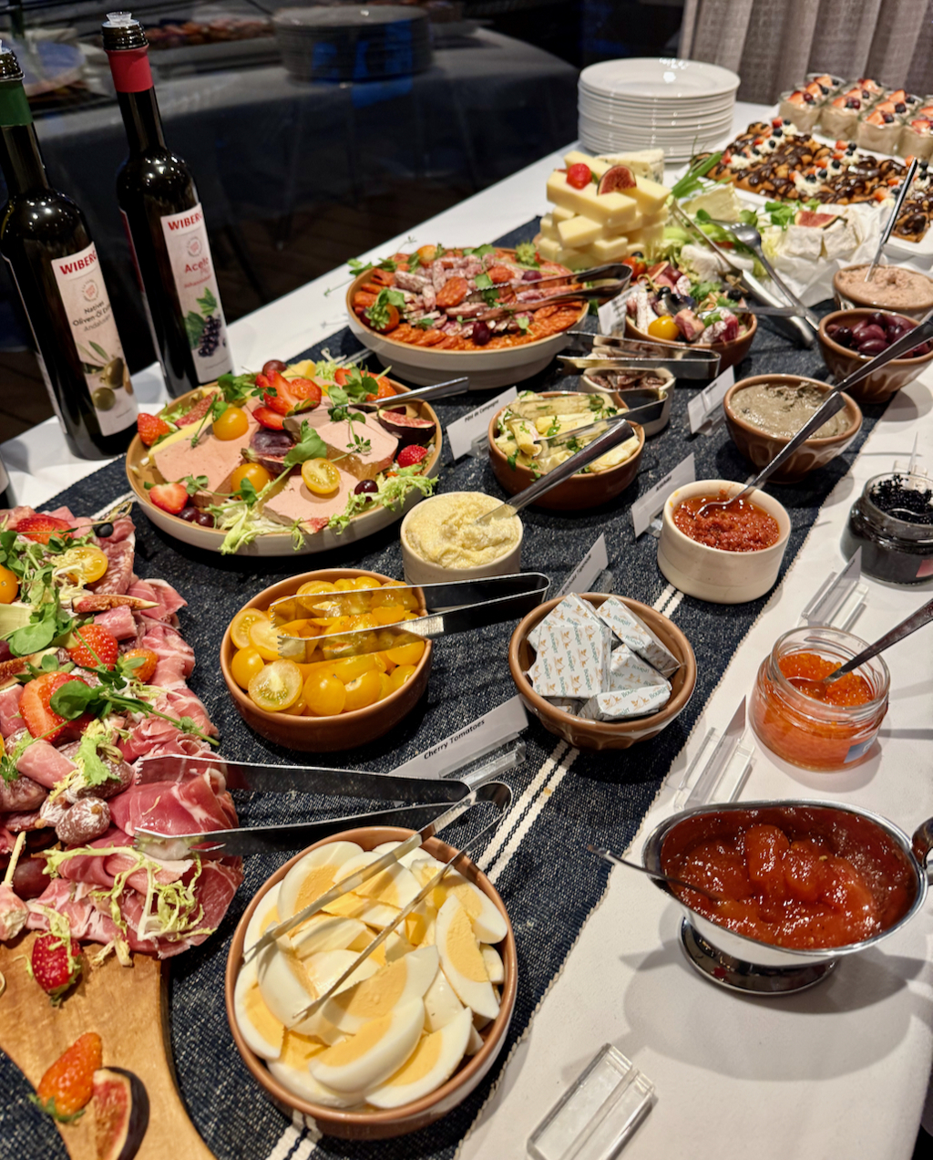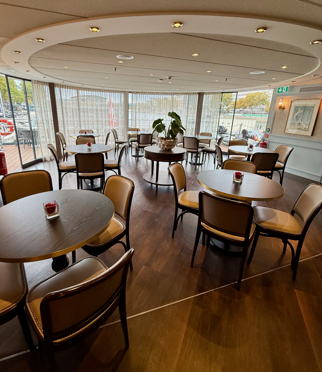 Le Bistro mène également au petit pont fumeurs, un délicieux clin d’œil au Paris cinématographique niché dans l’air normand. Un souffle de Gauloises, une allusion à Truffaut, un groupe d’invités discutant doucement sur fond du léger flux du fleuve. Culiniarement, le buffet du Bistro reflète l’absence d’une cuisine complète : fromages, charcuterie et quelques plats chauds apparaissent ponctuellement. Ce n’est pas l’endroit où chercher l’émerveillement, ce rôle appartient fermement au restaurant principal, mais c’est un coin fascinant et détendu du navire. Son objectif est de créer une ambiance, pas de la magie, et à cet égard, il réussit parfaitement.